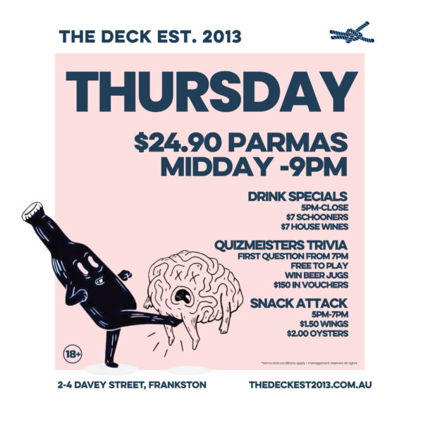 Good food starts with good ingredients and we bring you only the best. At The Deck Est. 2013 you will find classic pub fare alongside modern Australian cuisine. We take great pride in our menu and it is our pleasure to share it with you.